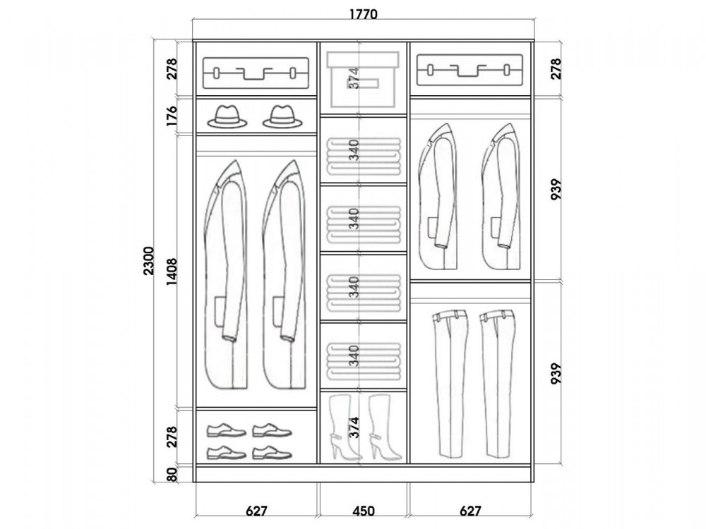 Модель 3-х дверного шкафа (полки в центре)